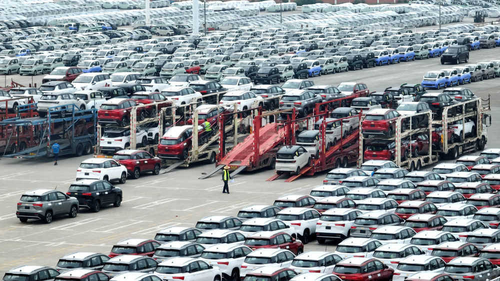 9月11日,工人在广西柳州汽车城一家物流园把商品车装上货车(无人机照片)。(新华社发)