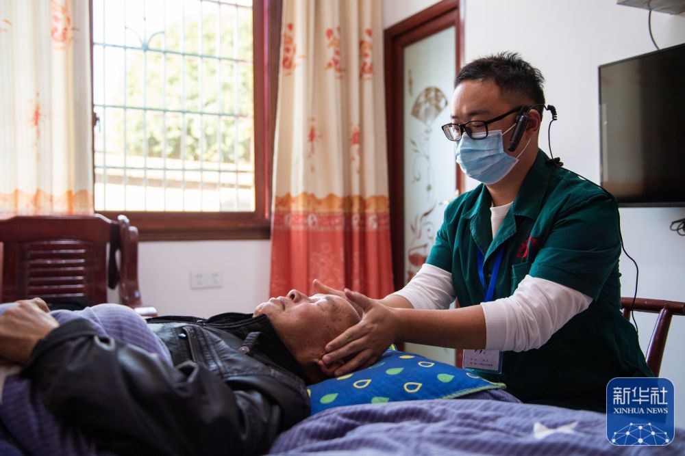 2021年11月12日,在湖南省长沙市长沙县果园镇田汉社区,医务人员彭永(右)为居家老人做头部推拿。新华社记者 陈思汗 摄