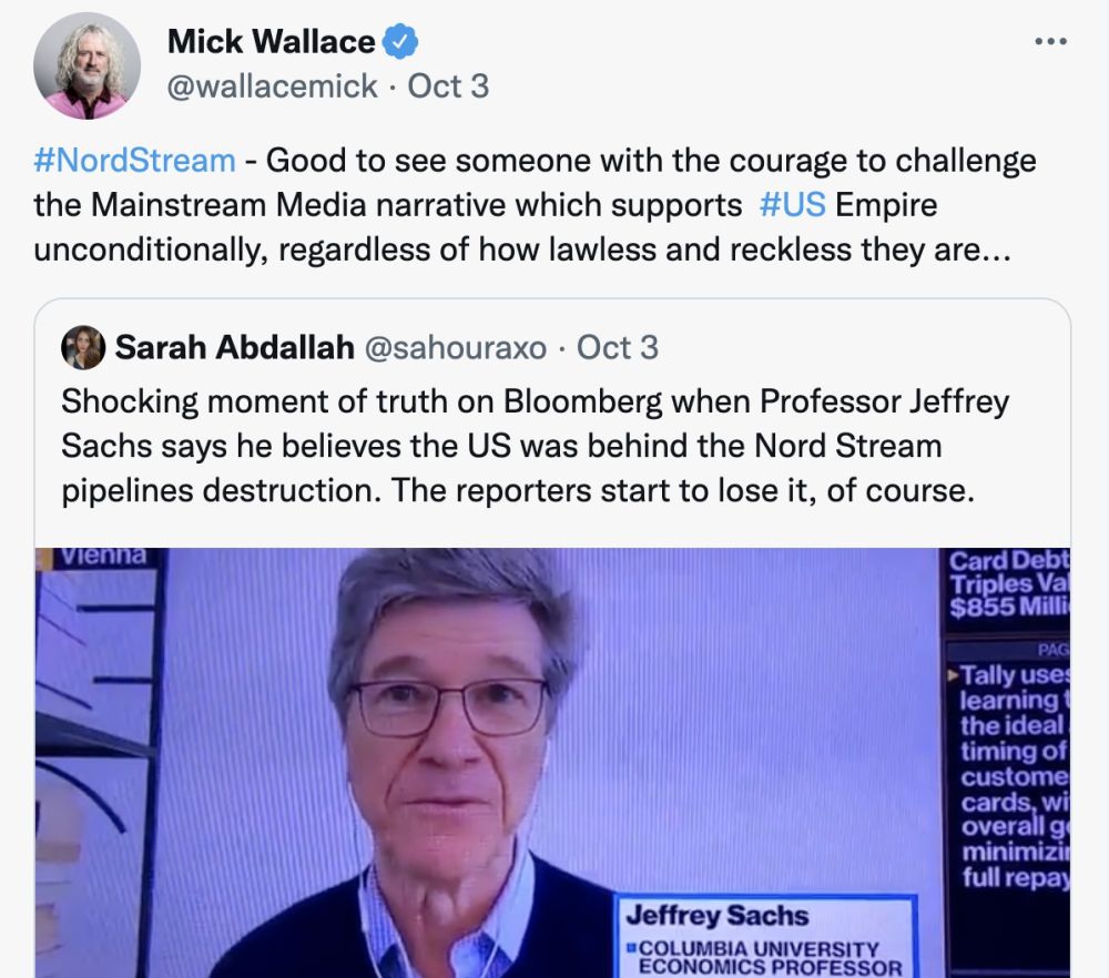 欧洲议会议员米克·华莱士3日在社交媒体上转发了彭博社对萨克斯的采访视频片段,并留言评论:“很高兴看到有人勇敢挑战当前主流媒体无条件支持‘美帝国’的叙事方式,无论美国行事多么无法无天、肆无忌惮。”