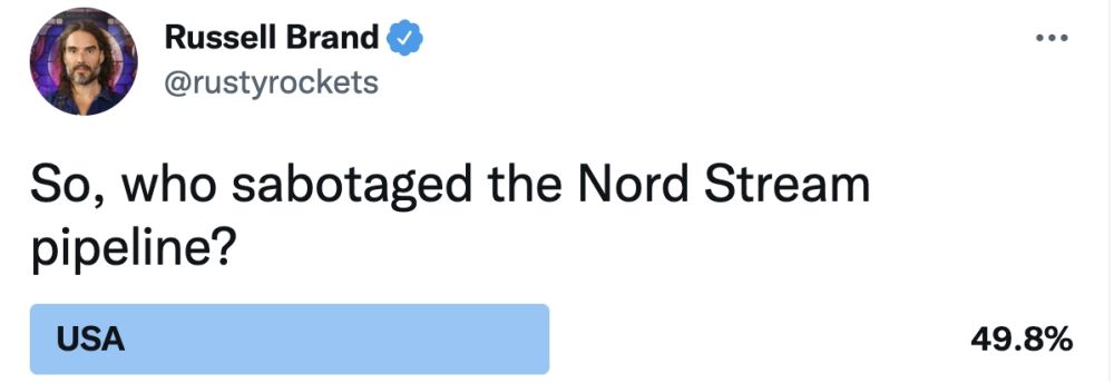 英国演员及政治活动人士拉塞尔·布兰德在社交媒体上发起“谁破坏了‘北溪’管道?”投票,吸引近2万网友参与。美国以49.8%得票率名列第一。