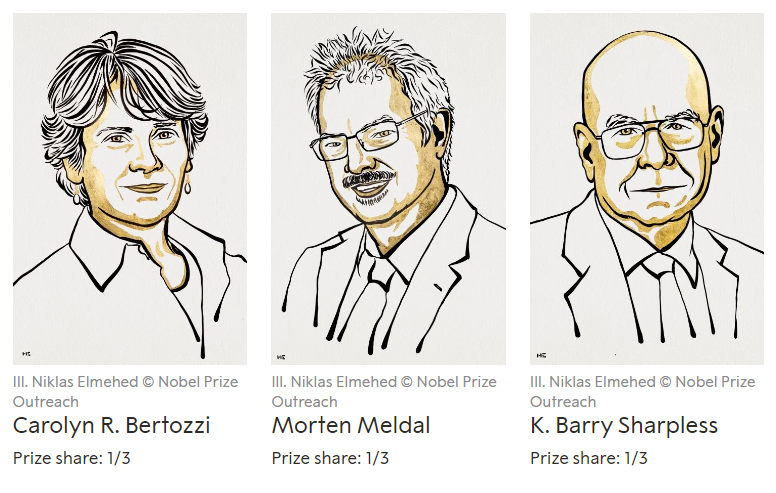 2022年诺贝尔化学奖授予美国科学家卡罗琳·贝尔托西 (Carolyn R. Bertozzi)、丹麦科学家摩顿·P·梅尔达尔 (Morten P. Meldal)、美国科学家卡尔·巴里·夏普利斯(K. Barry Sharpless)以表彰他们在点击化学和生物正交化学领域作出的贡献。