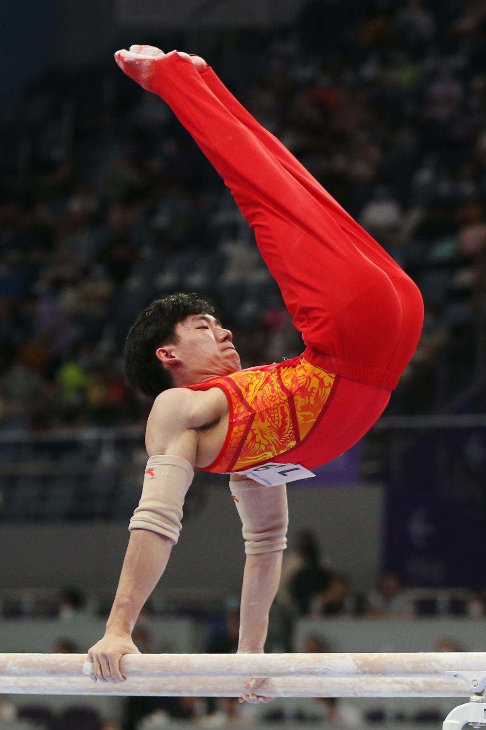 9月9日,湖南队选手张博恒在全国体操锦标赛男子双杠决赛中,他获得该项目冠军。新华社记者 许雅楠 摄