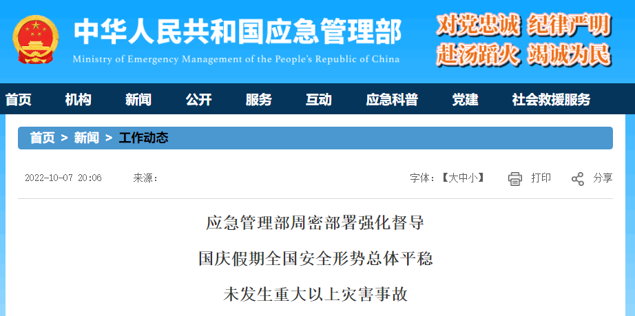 (原标题《应急管理部周密部署强化督导 国庆假期全国安全形势总体平稳 未发生重大以上灾害事故》)