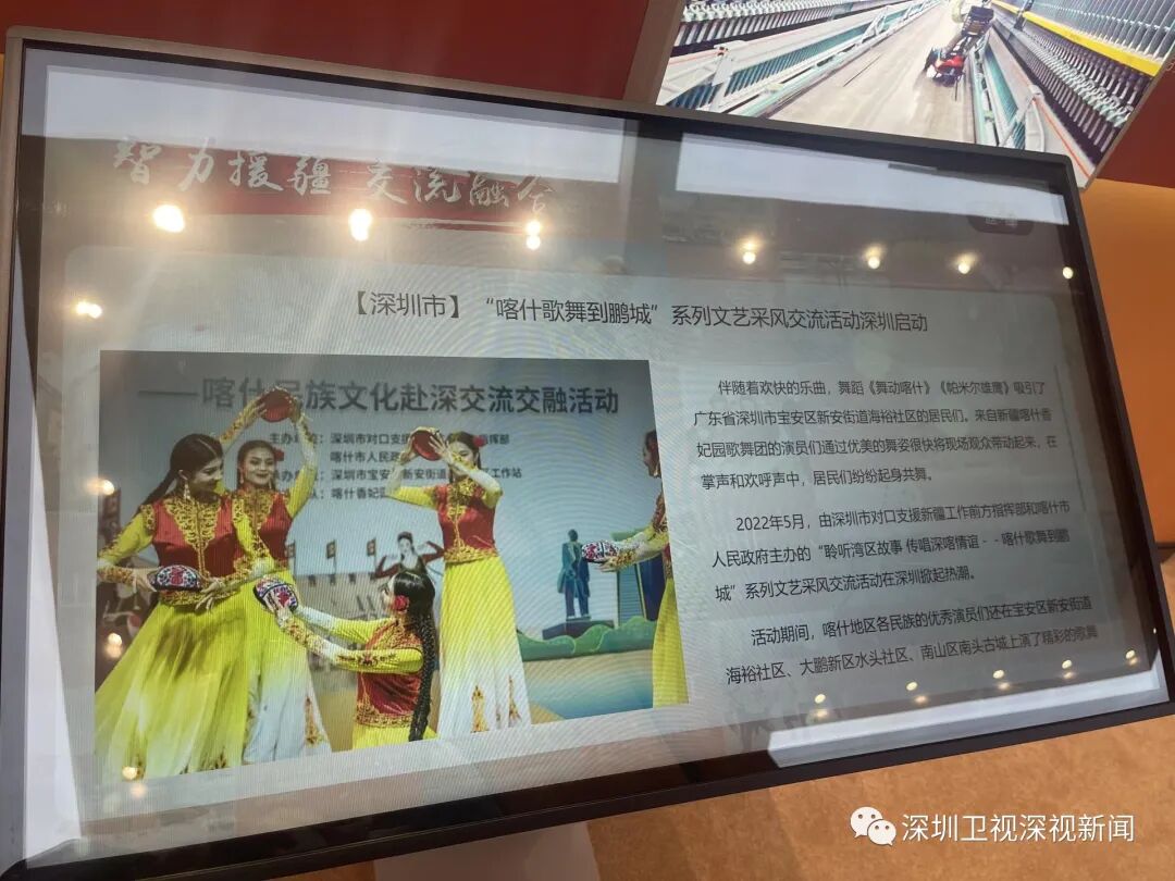 记者在新疆单元内的互动屏上,还看到循环播放的各地援疆故事。其中,“喀什歌舞到鹏城”系列文艺采风交流活动展现了两地人民的友好来往。