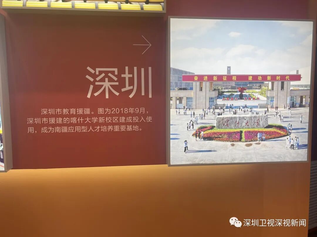 在新疆单元,“对口援疆、情暖天山”板块重点展示了国家机关、中央企业暨19个援疆省市对新疆的支持和援助。其中,由深圳市投入建设的喀什大学新校区的照片也在其中。