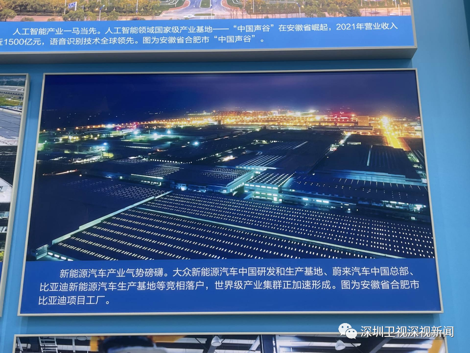 安徽单元展区也同样能看到深企比亚迪的身影。一幅灯火通明的工厂照片,展现了当地新能源汽车产业发展的良好势头。