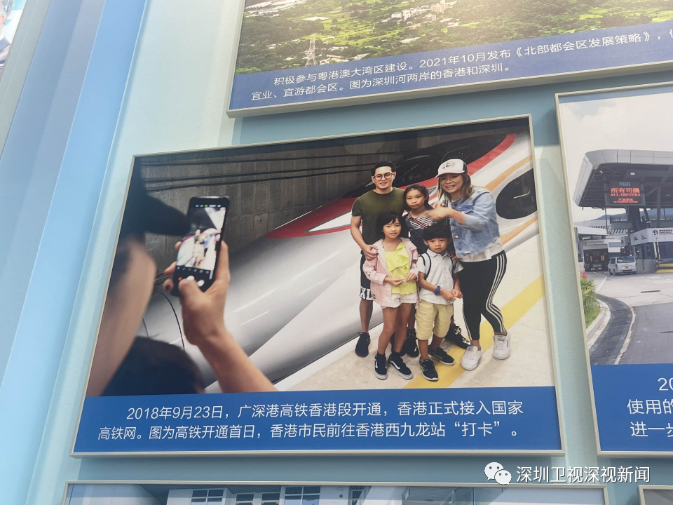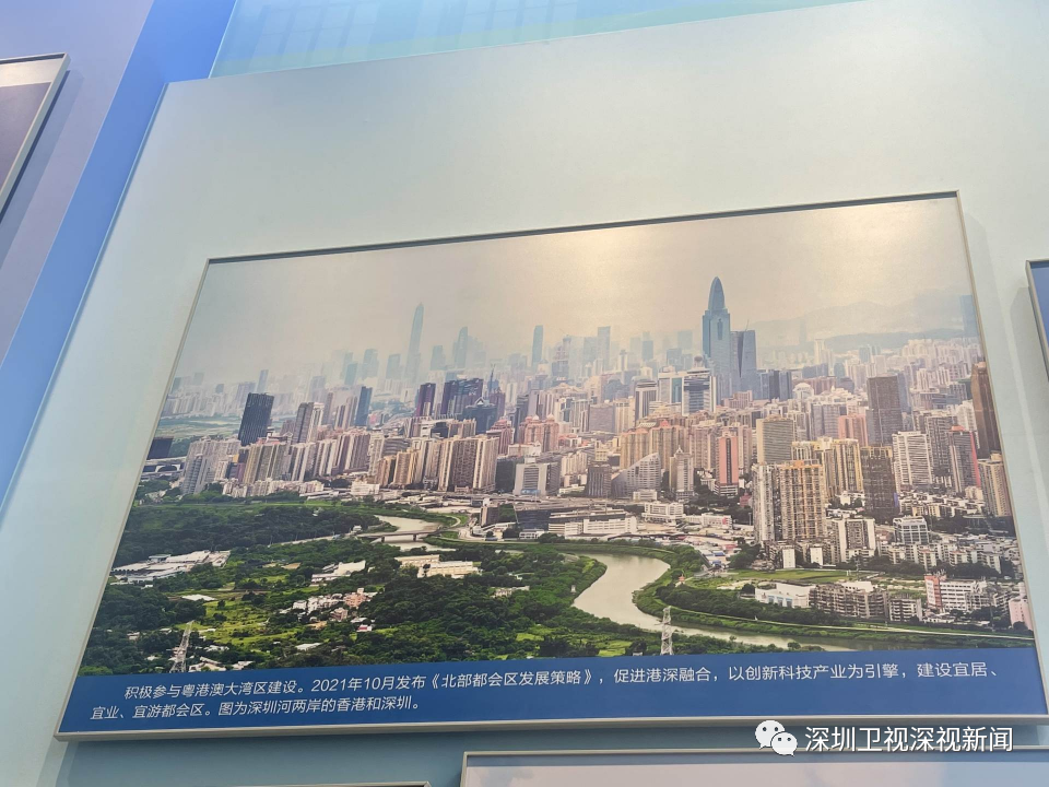 除了广东单元,“深圳元素”出场率最高的展区当属香港单元。在这里,首先映入眼帘的便是一张深圳河两岸的香港和深圳的“合影”。