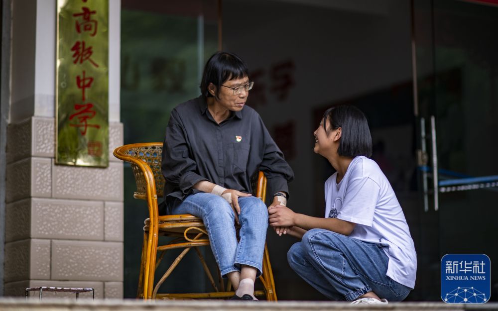 云南丽江华坪女子高级中学党支部书记、校长张桂梅在校园内与学生交谈(2021年8月23日摄)。新华社记者 江文耀 摄