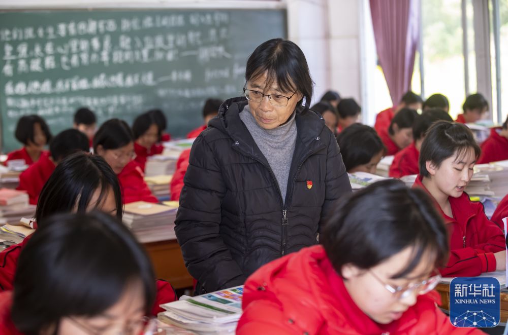 云南丽江华坪女子高级中学党支部书记、校长张桂梅(中)在教室里检查学生上课情况(2020年12月1日摄)。新华社记者 陈欣波 摄