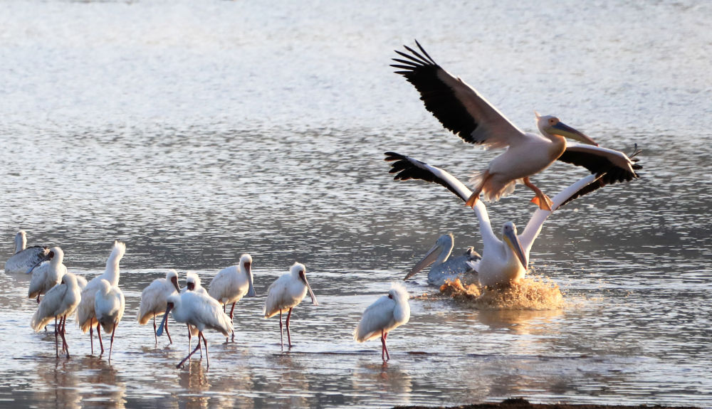 这是5月13日在肯尼亚纳库鲁湖拍摄的鹈鹕。新华社记者董江辉摄
