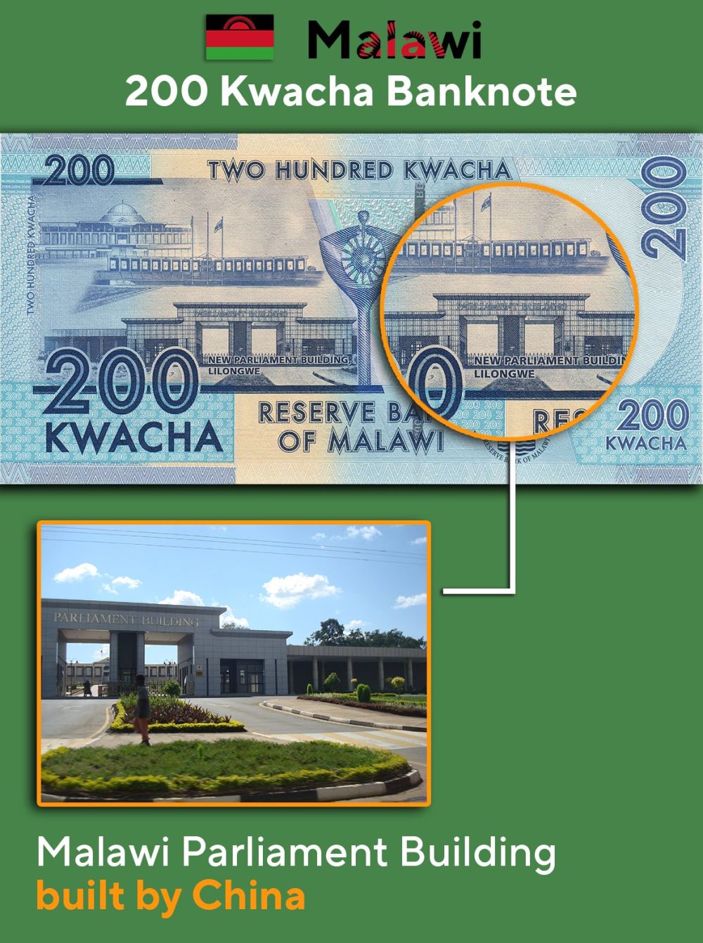 马拉维面额200克瓦查纸币——议会大厦。