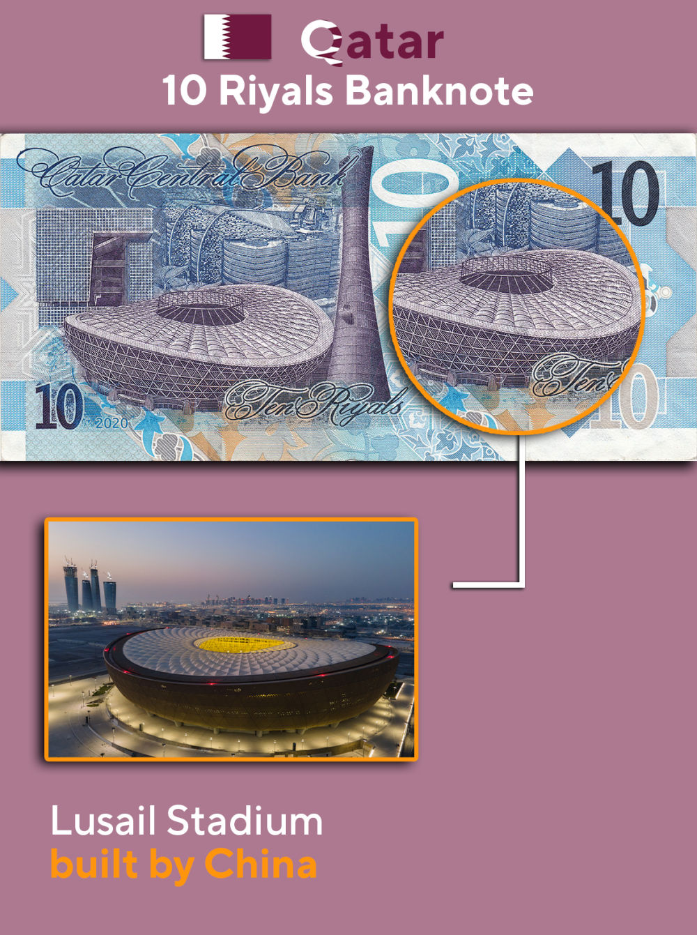 卢赛尔体育场位于卡塔尔首都多哈以北约15公里处,是2022年卡塔尔世界杯主体育场。2016年11月,中国铁建国际集团有限公司中标该体育场建设项目。2020年12月,卢赛尔体育场登上卡塔尔中央银行新发行的面额10里亚尔纸币。