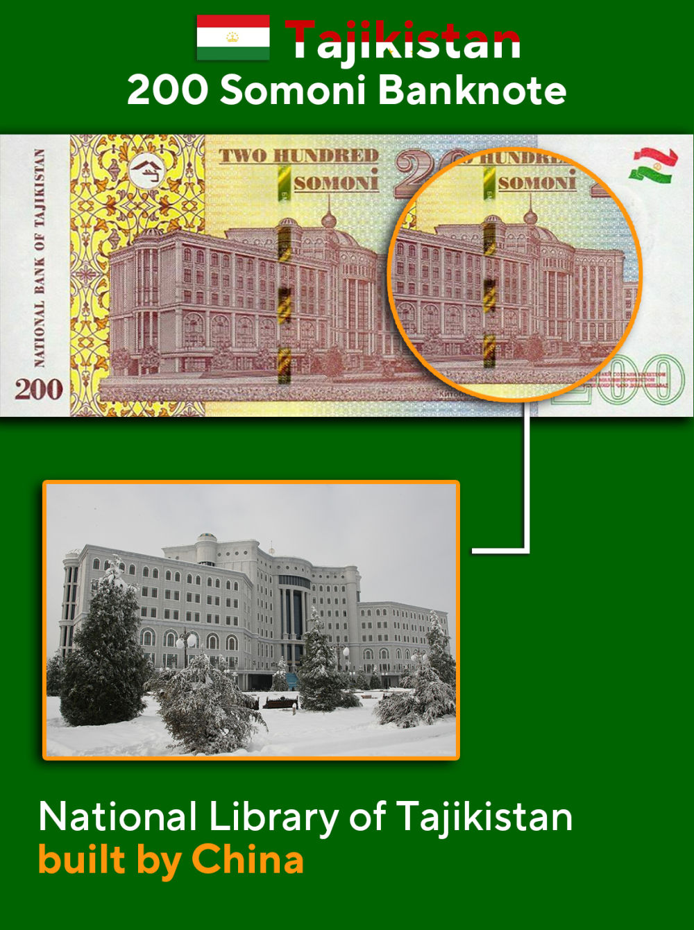 塔吉克斯坦面额200索莫尼纸币——塔吉克斯坦国家图书馆。