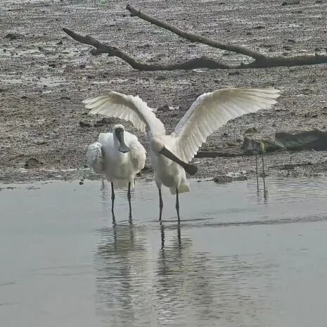 中午时分,潮水退去,6只黑脸琵鹭从树上飞至滩涂,觅食、清洗羽毛、歇息......