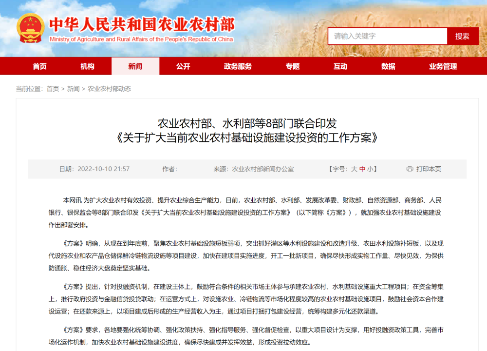 (原标题《农业农村部、水利部等8部门联合印发《关于扩大当前农业农村基础设施建设投资的工作方案》》)
