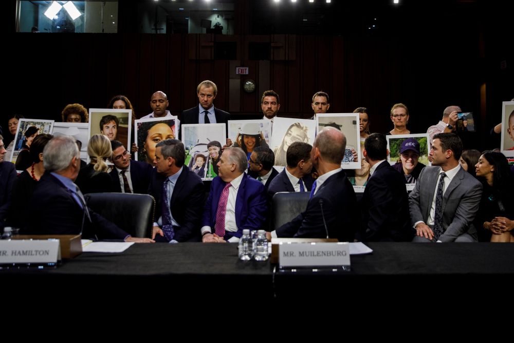 2019年10月29日,在美国华盛顿,时任波音公司首席执行官丹尼斯·米伦伯格(前右二)在国会参议院出席听证会。新华社发(沈霆摄)