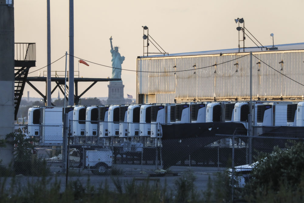 这是在美国纽约布鲁克林拍摄的一处临时停尸场内存放新冠患者遗体的冷藏车(2021年9月6日摄)。(新华社记者王迎摄)