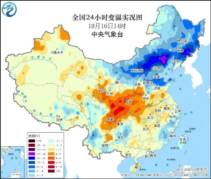 10月16日,冷空气继续南下,并逐渐进入影响最强时段。16日14时较15日14时,北方多地出现6~10℃降温,内蒙古赤峰、辽宁朝阳等地局地降温幅度超过12℃。