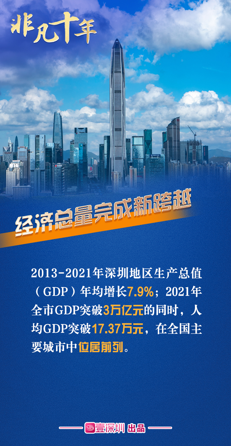 2013-2021年深圳地区生产总值(GDP)年均增长7.9%;2021年全市GDP突破3万亿元的同时,人均GDP突破17.37万元,在全国主要城市中位居前列。