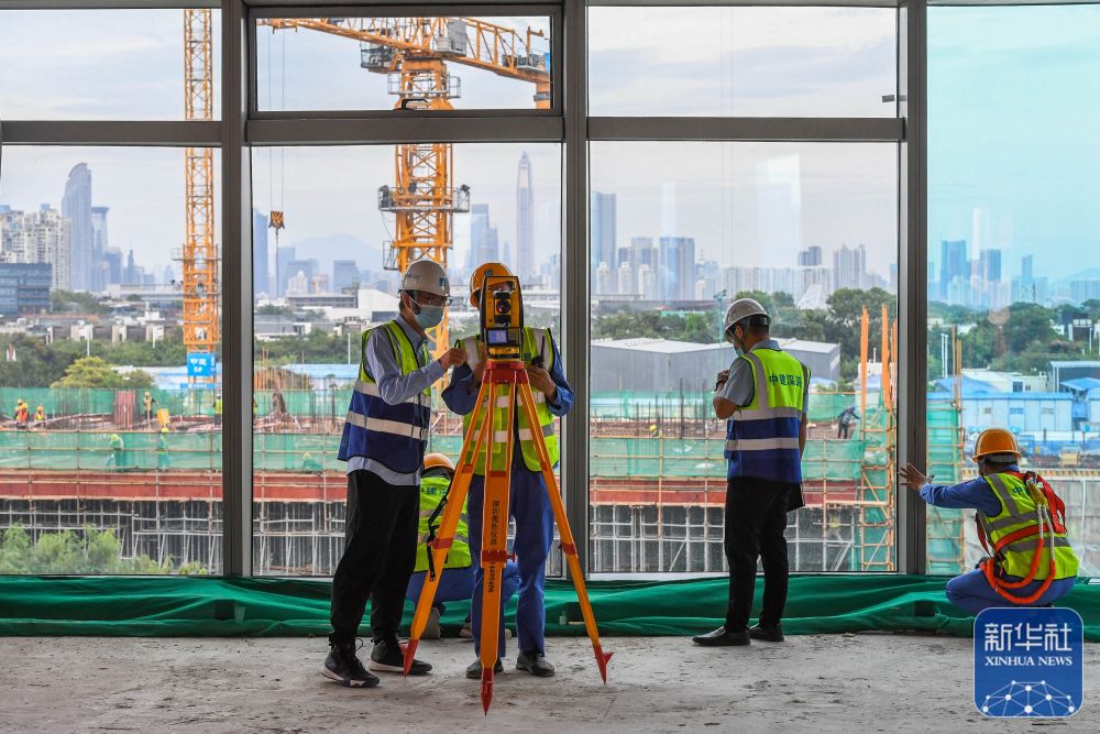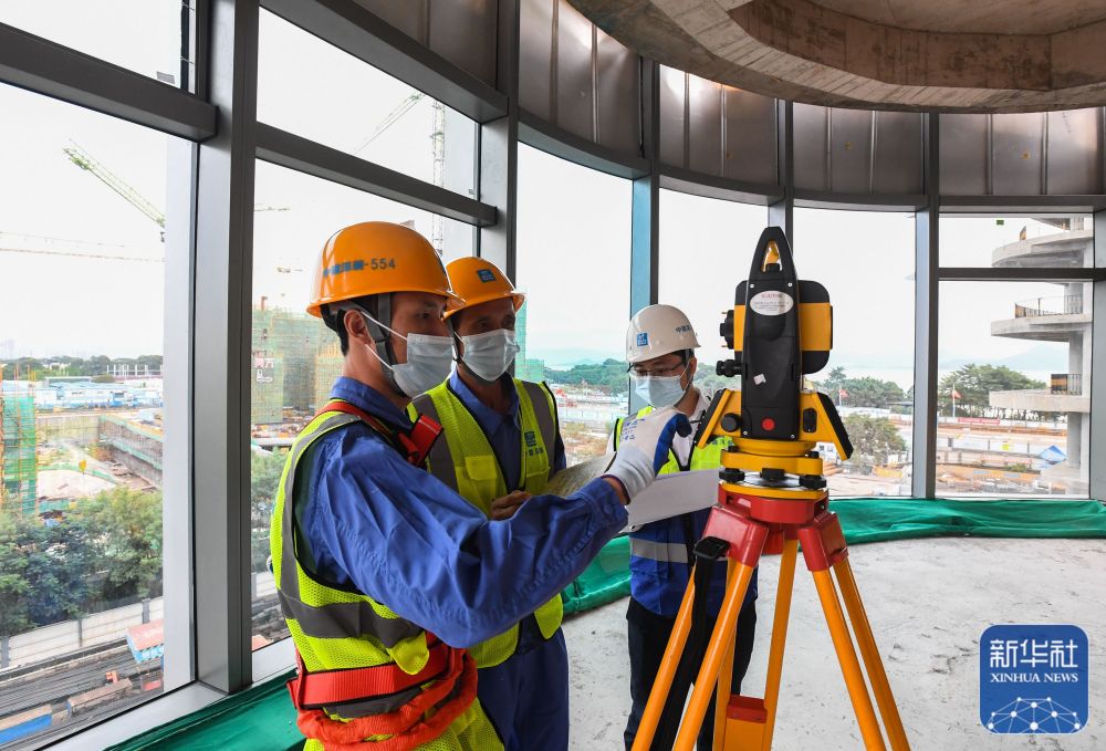 由中建深装承建的央企中国电子总部大厦进入幕墙同步安装阶段,技术人员在对首片弧面幕墙玻璃进行放线测量(10月19日摄)。