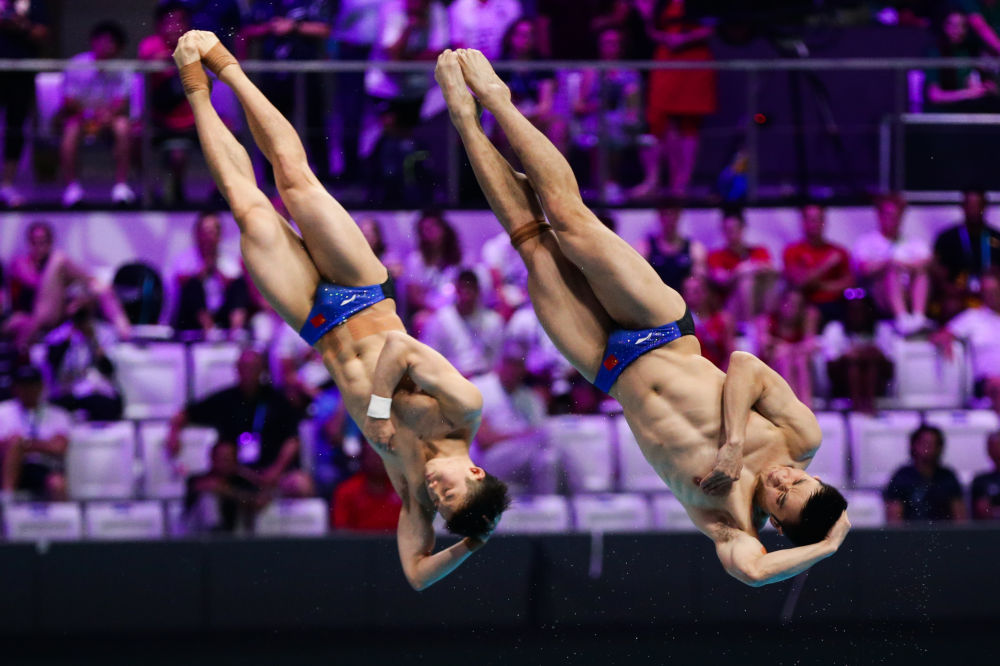 6月26日,曹缘(右)/王宗源在匈牙利首都布达佩斯举行的2022年世界游泳锦标赛跳水项目男子双人3米板决赛中。新华社记者 郑焕松 摄