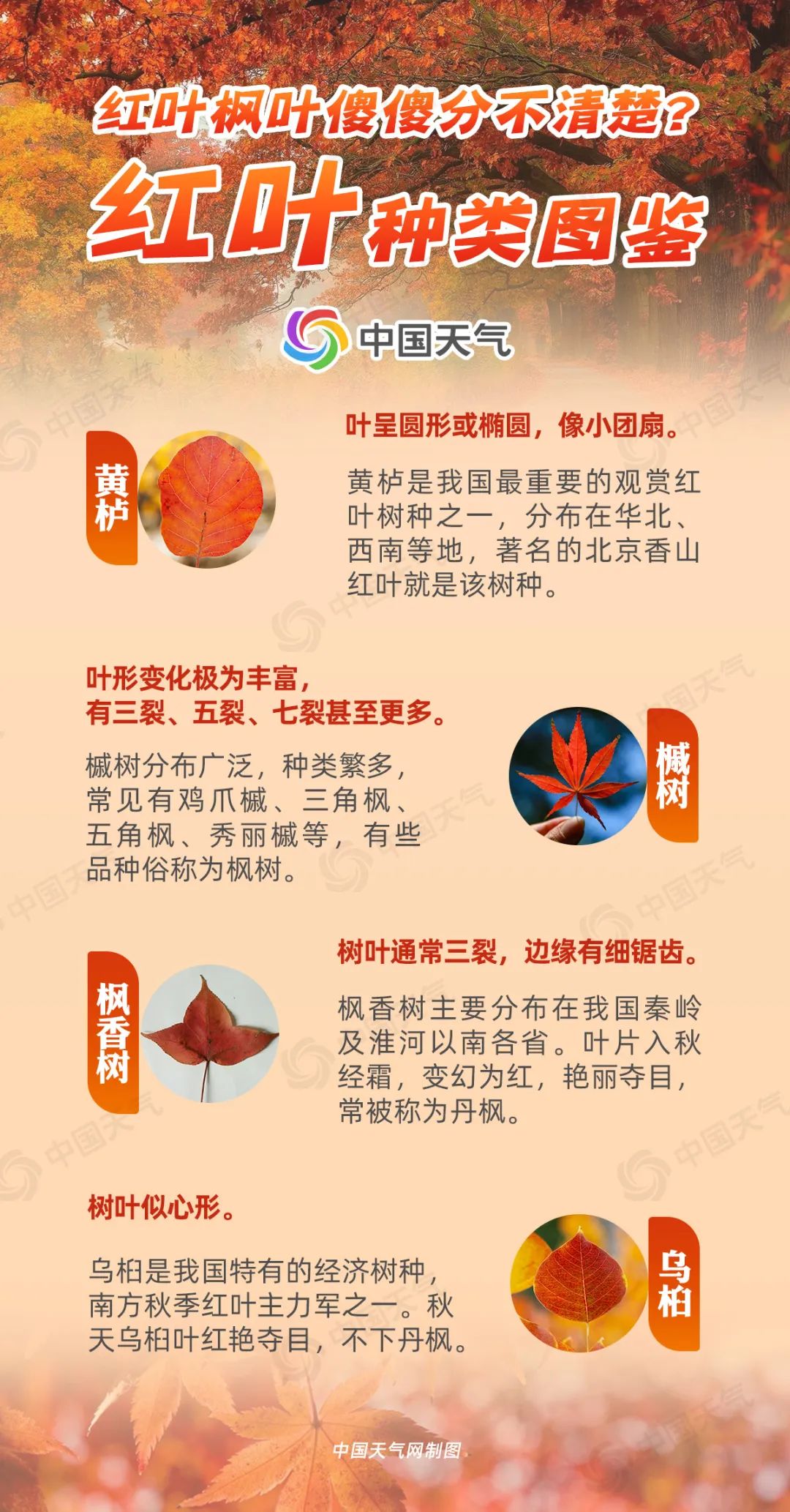 红叶属于季节性非常强的景观,错过就只能等明年了。快收好这份红叶图鉴,去感受这流彩飞韵的时节吧。中国天气网温馨提示,根据疫情防控要求,目前多地红叶景区需提前预约、并持核酸证明,大家出行前提前了解防疫政策,在景区游玩不扎堆不聚集做好防护,安全有序赏美景。
