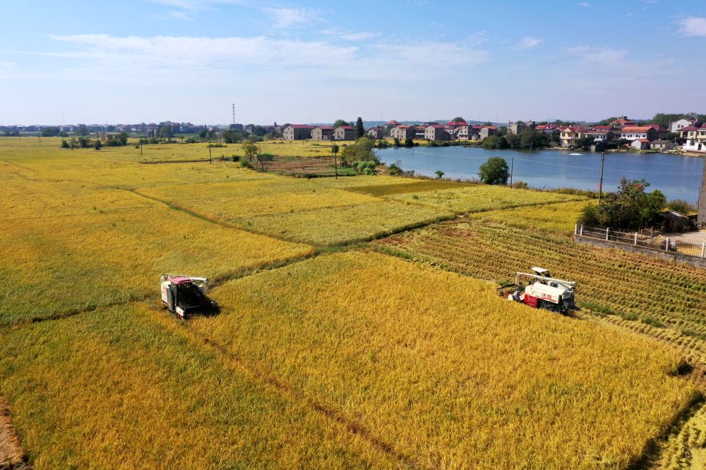 在江西省南昌市南昌县广福镇漳溪村,种植户在收割晚稻(10月20日摄,无人机照片)。新华社记者彭昭之摄