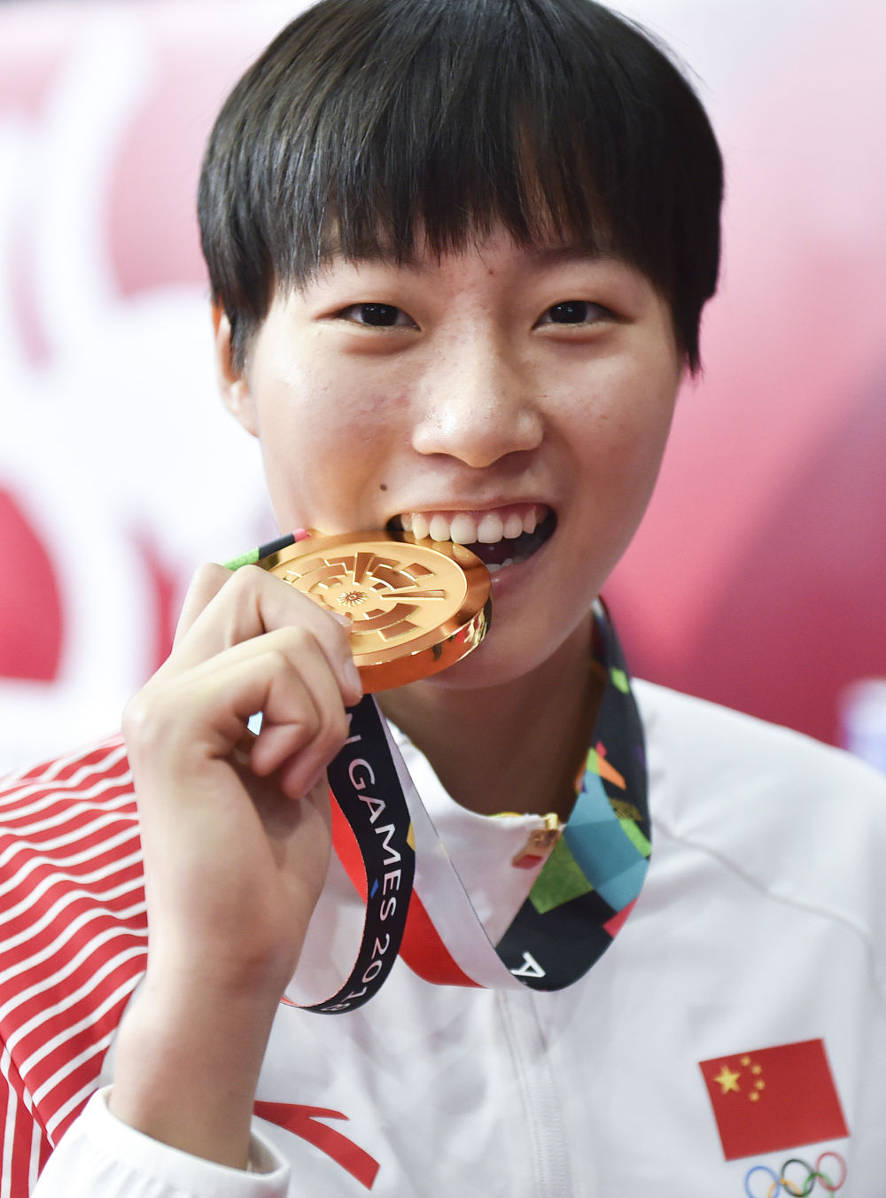 2018年8月21日,获得雅加达亚运会跆拳道女子57公斤级比赛冠军的中国选手骆宗诗在颁奖仪式后展示金牌。新华社记者 黄宗治 摄