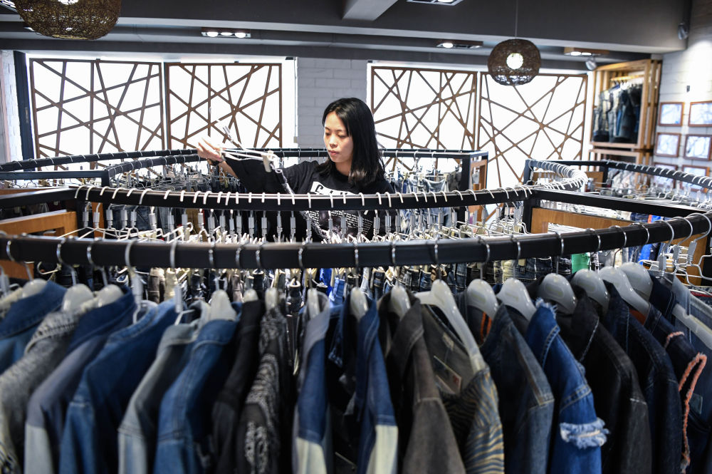 10月14日,在广东省纺织品进出口股份有限公司,工作人员在整理广交会线上展厅的服装。新华社记者 邓华 摄