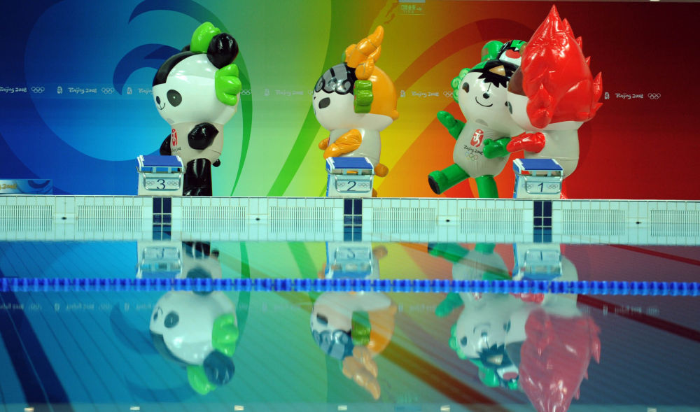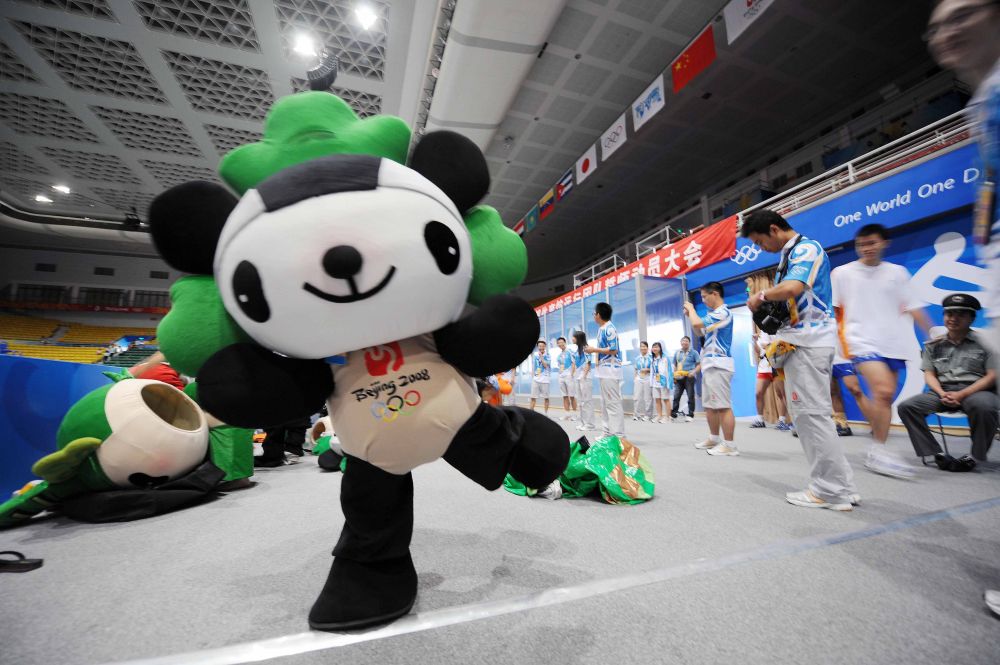 2008年8月17日,福娃“晶晶”、“迎迎”、“妮妮”和“欢欢”(从左至右)为选手助威。新华社记者赵鹏摄