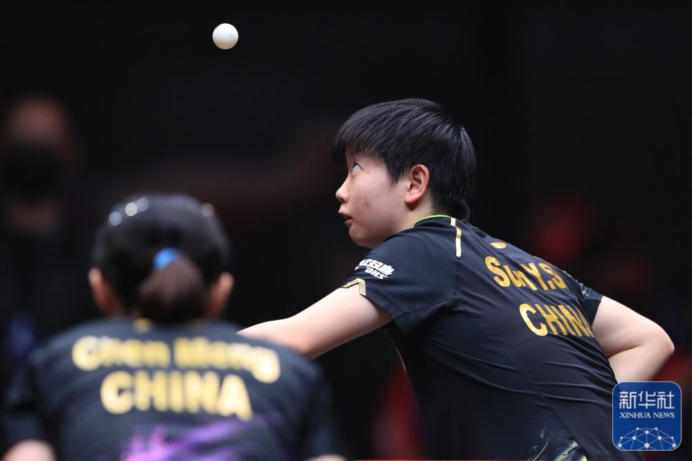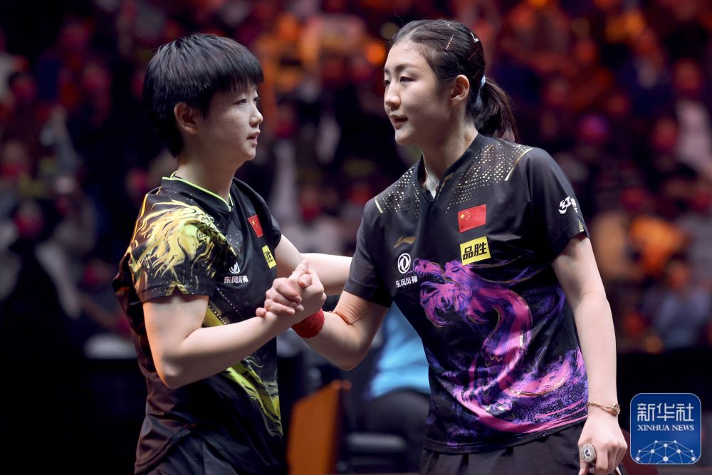 陈梦(右)祝贺队友孙颖莎夺冠。