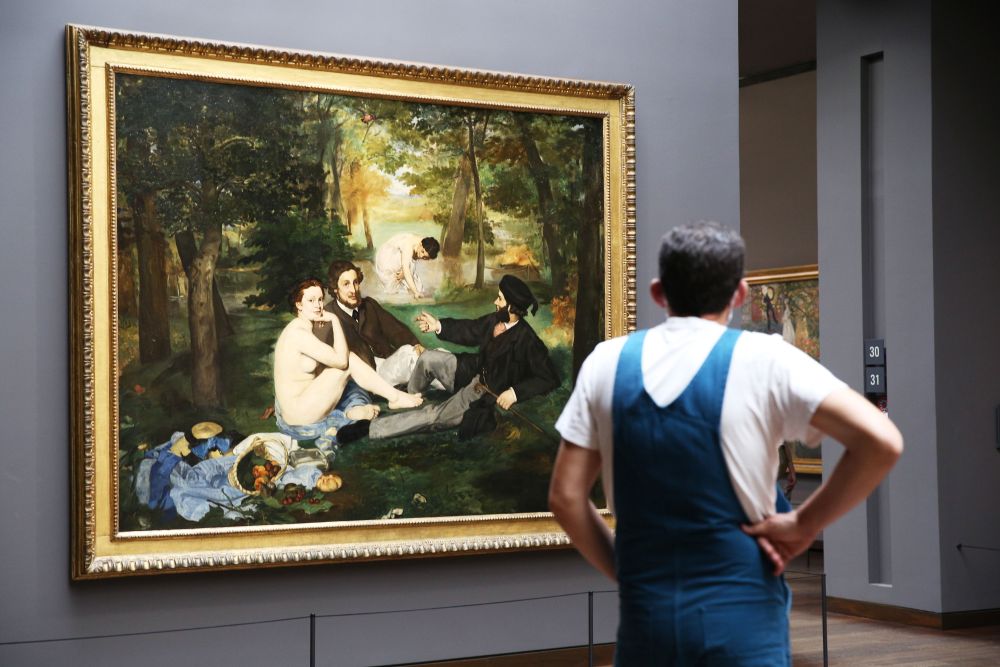 这是2020年6月23日一名男子在法国巴黎奥尔赛博物馆观赏马奈名画《草地上的午餐》的资料照片。(新华社记者高静摄)