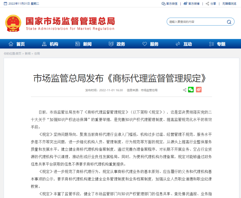 (原标题《市场监管总局发布<商标代理监督管理规定> 12月1日起施行》)