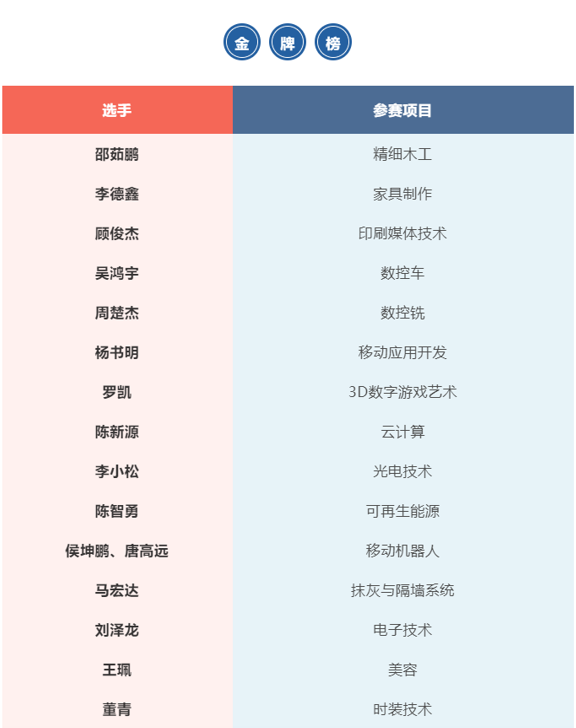 截至目前,世界技能大赛上中国代表团在已完赛的27个项目上获得了15枚金牌、3枚银牌、3枚铜牌和5个优胜奖,涵盖精细木工、家具、数控、设计、美容等多个领域。技能学子们在世界舞台,大放异彩。