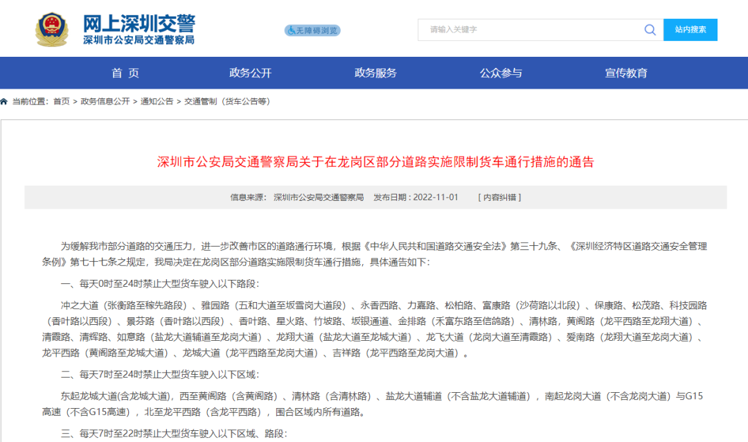 所有大型货车车主请注意,深圳市公安局交通警察局发布通告,为缓解深圳市部分道路的交通压力,进一步改善市区的道路通行环境,即日起至2023年11月2日,决定在龙岗区部分道路,实施限制货车通行措施。