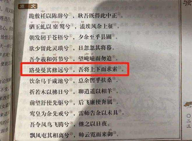 最近,杭州一位初三语文老师在备课时,语文课本里的一句诗“路曼曼其修远兮,吾将上下而求索”让她心里“咯噔”了一下。“路曼曼其修远兮”这句诗,出现在人教版语文教科书九年级上册的综合性学习内容中。该综合性学习内容的主题为“君子自强不息”。文中表示,中国古典诗词中不乏体现自强不息精神和风骨的作品。课本里列举了三句诗词名句,让同学们感受古人自强不息的精神,理解自强不息的含义。其中之一就是“路曼曼其修远兮,吾将上下而求索”。