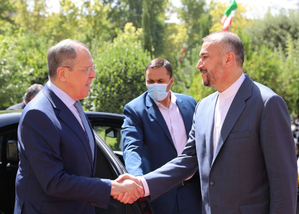 6月23日,伊朗外长阿米尔-阿卜杜拉希扬(右)在德黑兰迎接俄罗斯外长拉夫罗夫。新华社发(伊朗外交部供图)