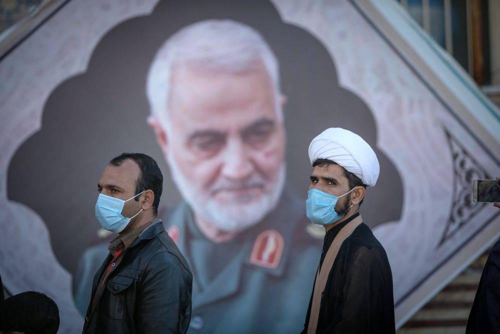 2021年1月2日,人们在位于伊朗克尔曼的伊斯兰革命卫队下属“圣城旅”指挥官苏莱曼尼墓附近参加他的遇难周年悼念活动。2020年1月3日,美国在伊拉克首都巴格达发动袭击,杀死苏莱曼尼。新华社发(艾哈迈德·哈拉比萨斯 摄)