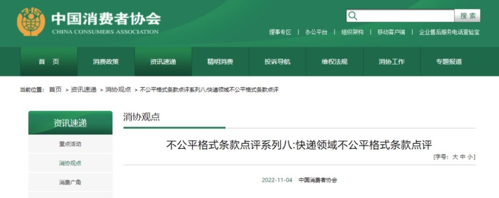 11月4日,中国消费者协会发布不公平格式条款点评系列八,邀请中消协律师团律师对消费者反映强烈的快递领域不公平格式条款和现象进行点评。