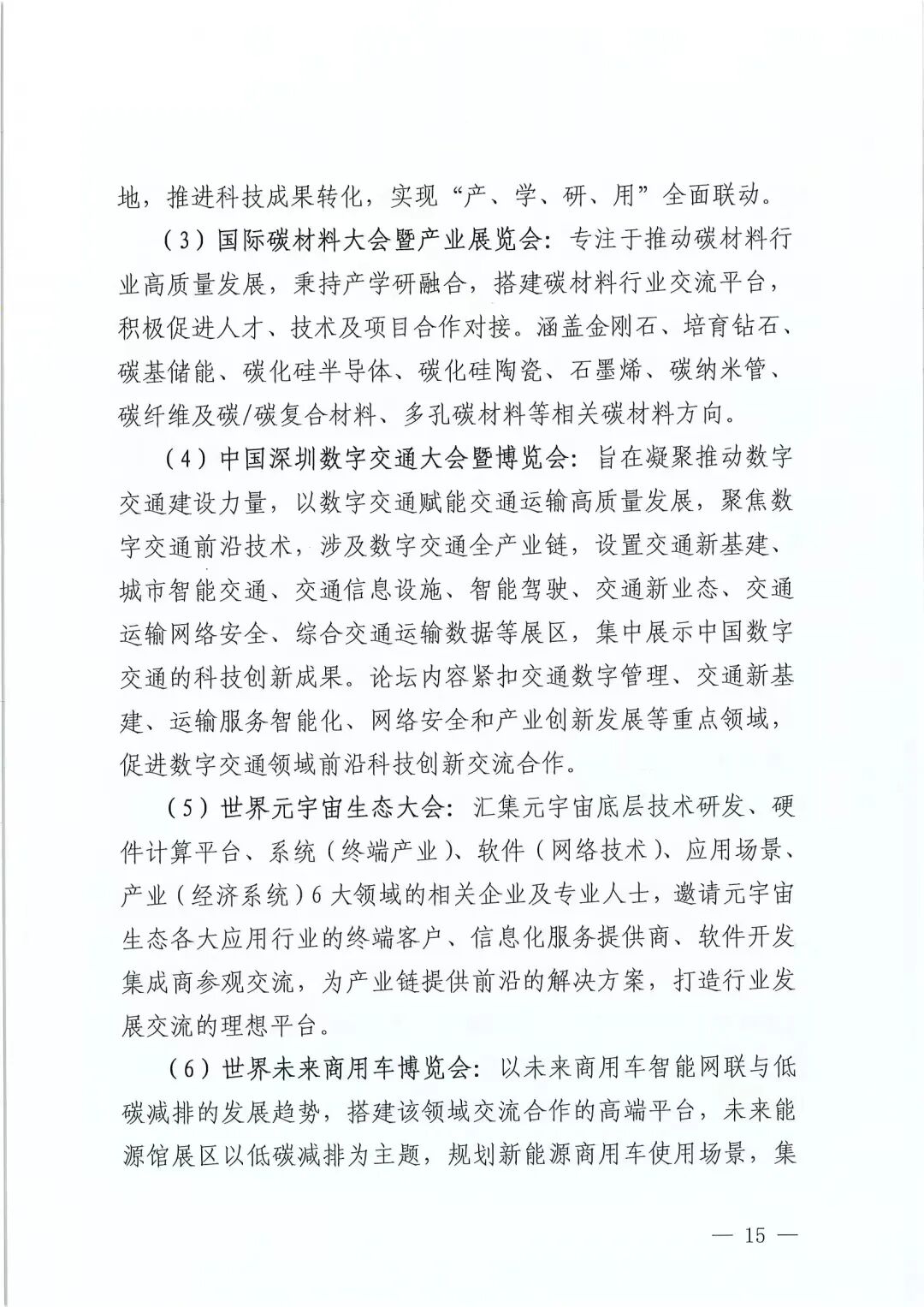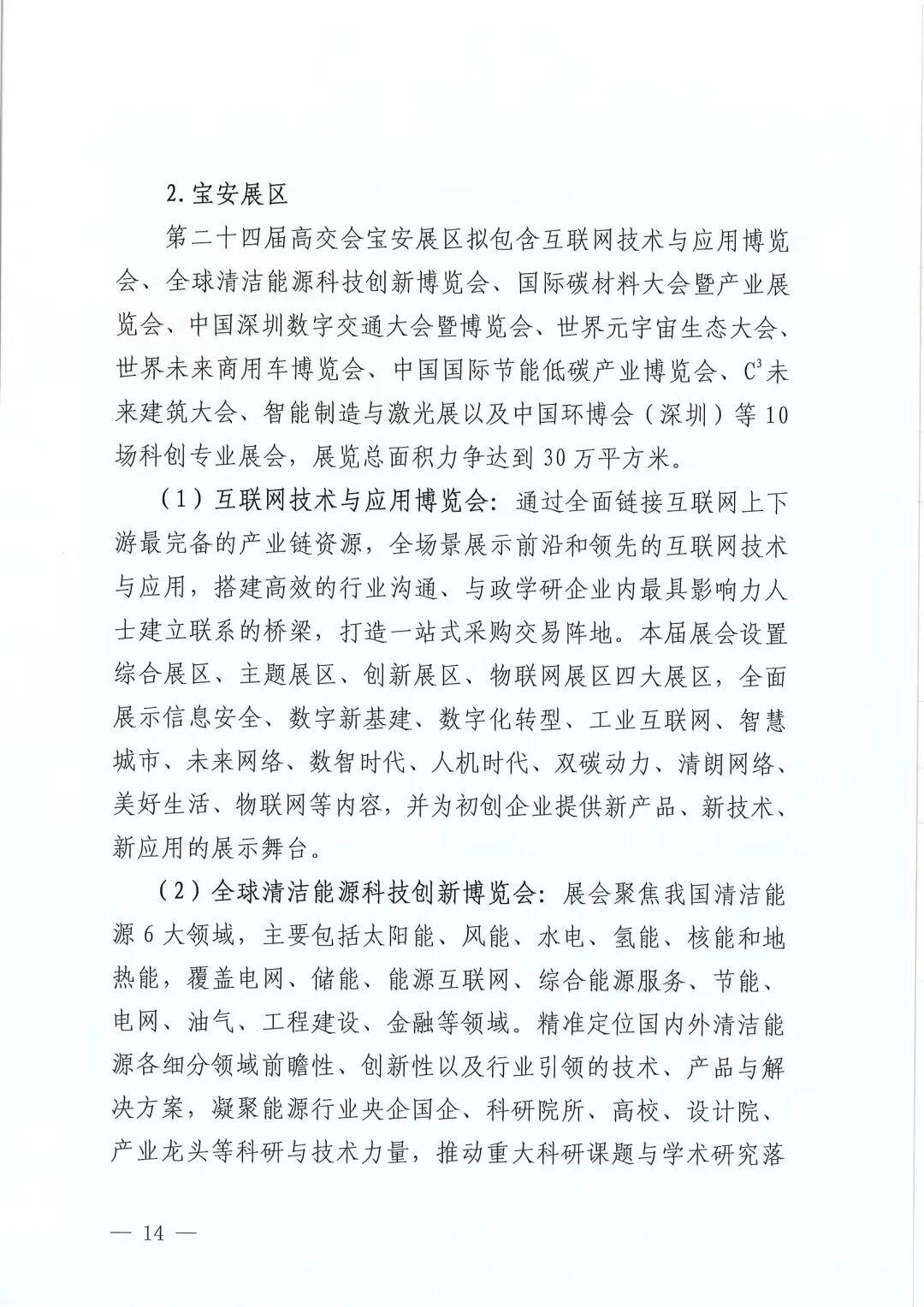 宝安展区展览总面积力争达到30万平方米,拟包含互联网技术与应用博览会、全球清洁能源科技创新博览会、国际碳材料大会暨产业展览会、中国深圳数字交通大会暨博览会、世界元宇宙生态大会、世界未来商用车博览会、中国国际节能低碳产业博览会、C³未来建筑大会、智能制造与激光展以及中国环博会(深圳)等10场科创专业展会。