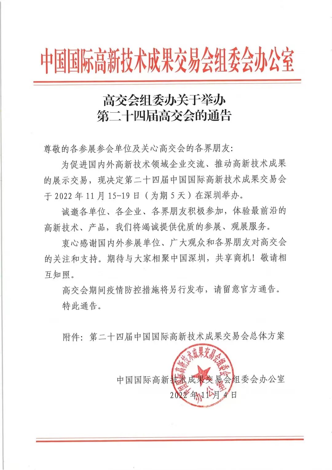 11月4日下午,高交会组委会在其官网挂出关于举办第二十四届高交会的通告,诚邀各界朋友相聚深圳,共享商机。