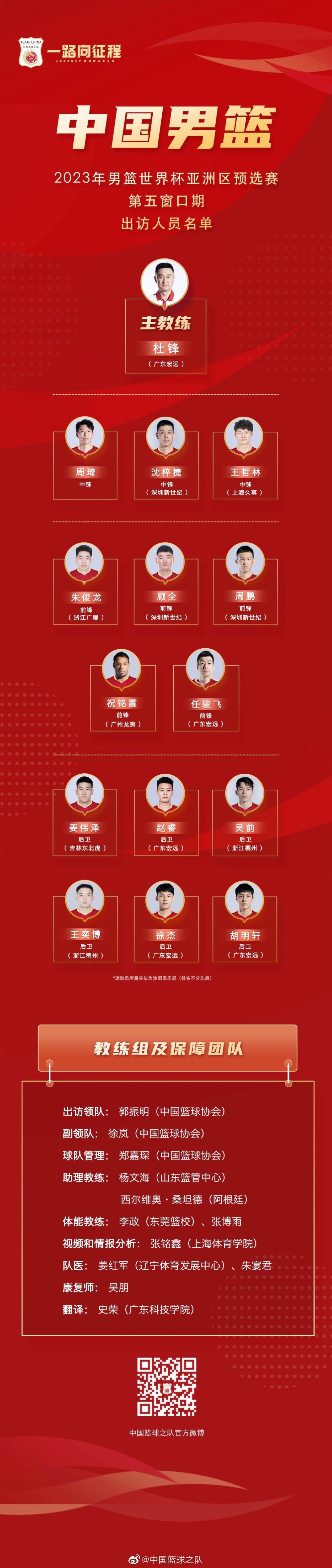 7日,中国男篮公布了2023世界杯亚洲区预选赛第五窗口期的14人出访大名单,周琦将带伤到国家队报到。