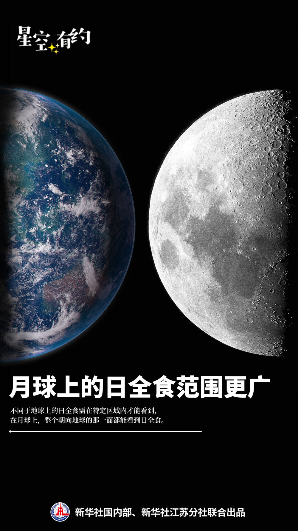 地球体积大于月球,所以月球上的日全食耗时更长、范围更广。“通俗地说,月球发生日全食时,观测者会看到太阳被一个更大的物体遮住了,遮挡时间更久,好像一次‘日全食plus’。”王科超说,月球上的日全食最长会持续几个小时,而地球上的日全食最长只有七分多钟。