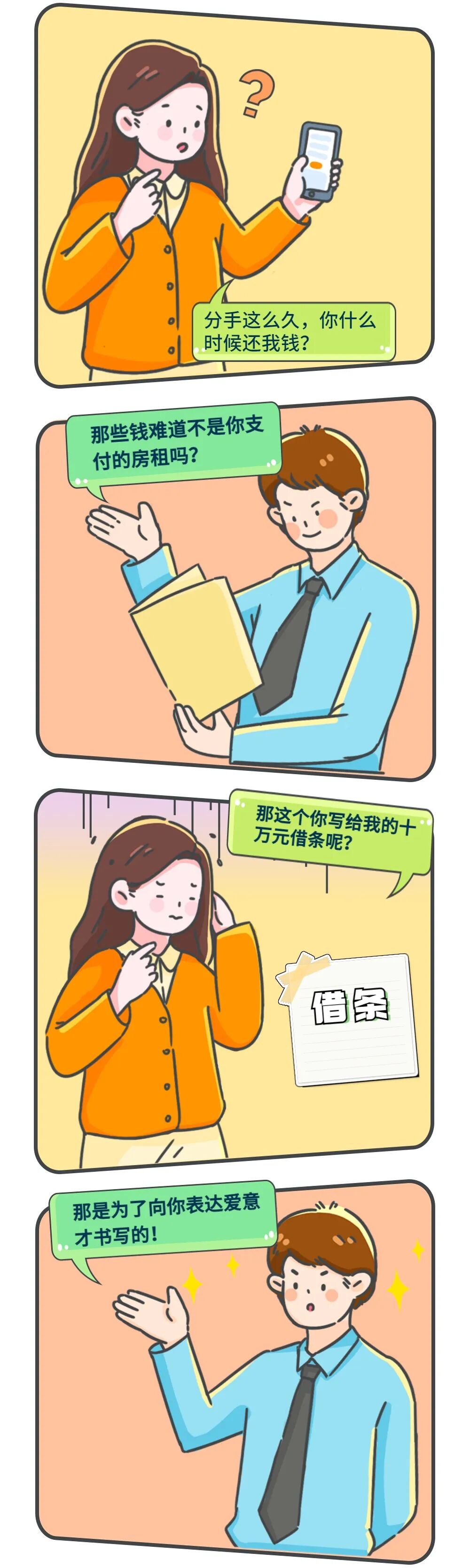 3.不要以出具借条、欠条等形式表达忠诚、爱意。情侣间应培养健康的恋爱观,如不存在真实的借贷关系,应慎重出具书面证据。