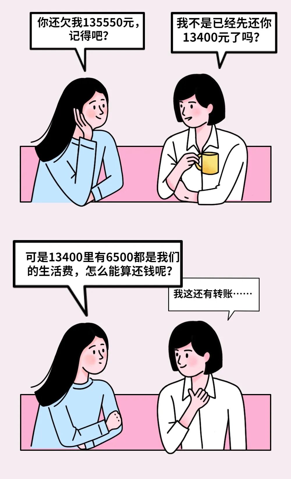 根据段先生提交的转账记录,段先生辩称已于2022年1月13日后还款总计13400元,汤女士却主张已还款6900元,其余6500元转款是用于二人共同生活开支。