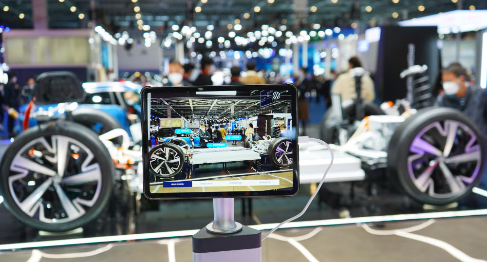 这是11月6日在第五届进博会汽车展区大众汽车展台拍摄的电动车模块化平台AR体验系统。新华社记者 金皓原 摄