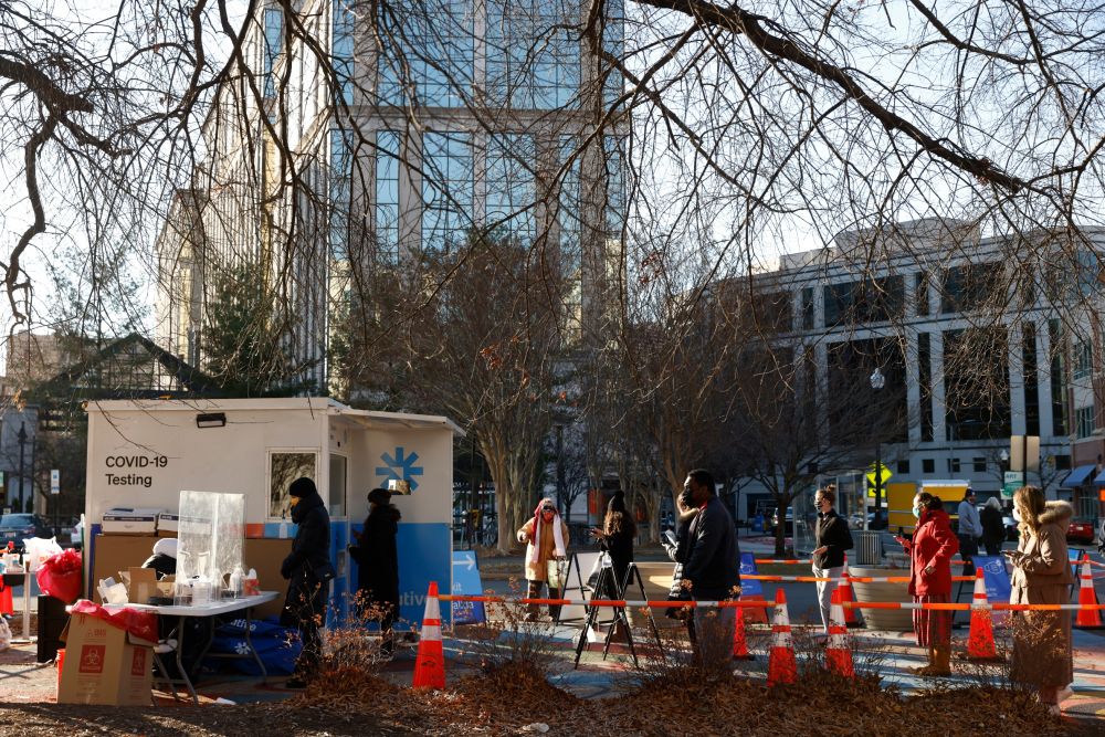 图为2021年12月22日,在美国弗吉尼亚州阿灵顿,人们排队进行新冠病毒检测。新华社发(沈霆摄)