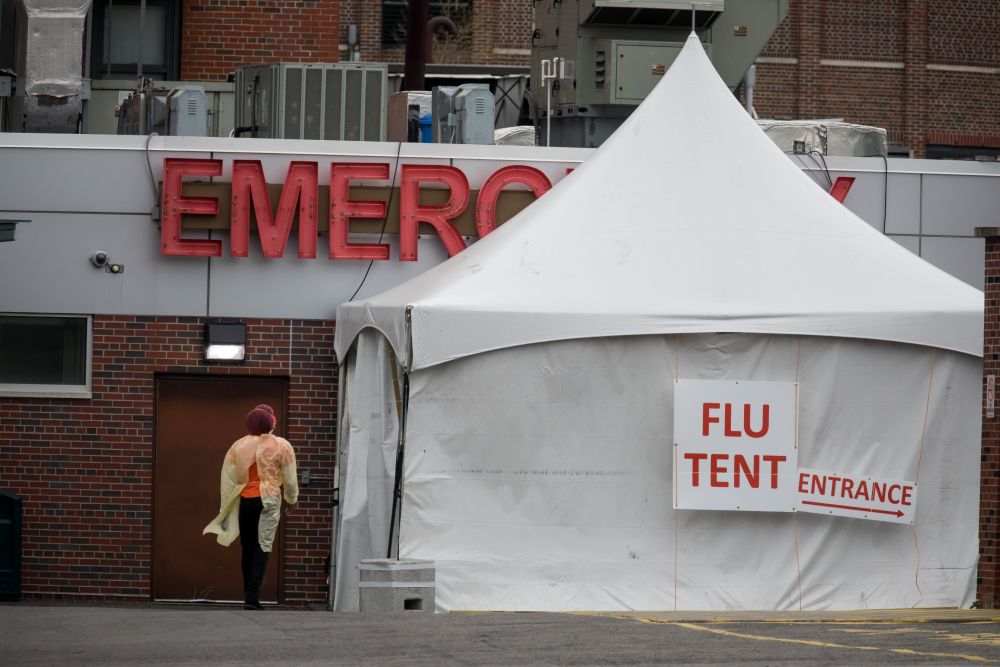 图为2020年4月19日,在美国纽约一家医院外,医护人员从写有“流感帐篷”字样的帐篷外走过。新华社发(郭克摄)