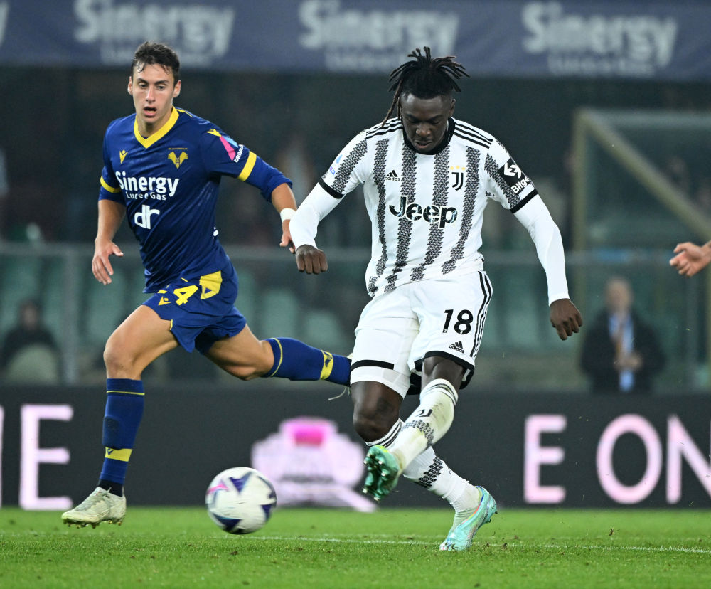 尤文图斯队球员莫伊塞·基恩(右)在比赛中攻入进球。摄影:阿尔贝托·林格利亚 来源:新华社