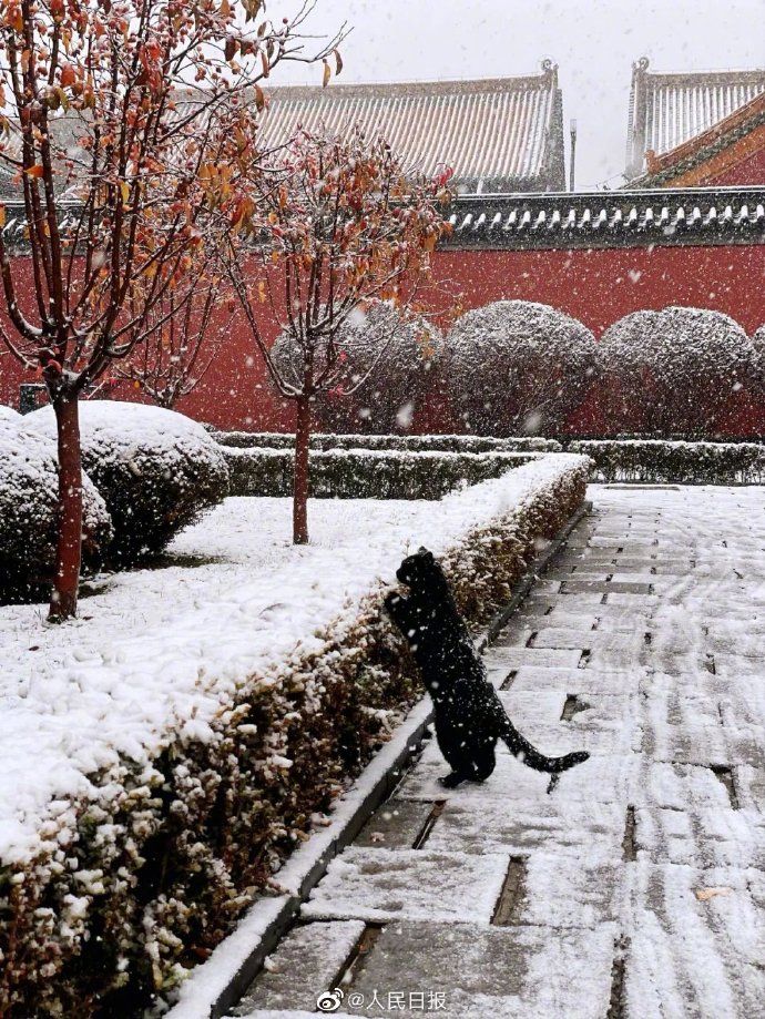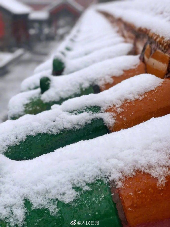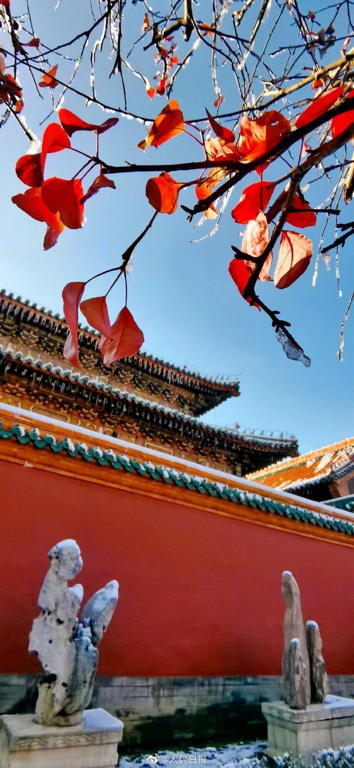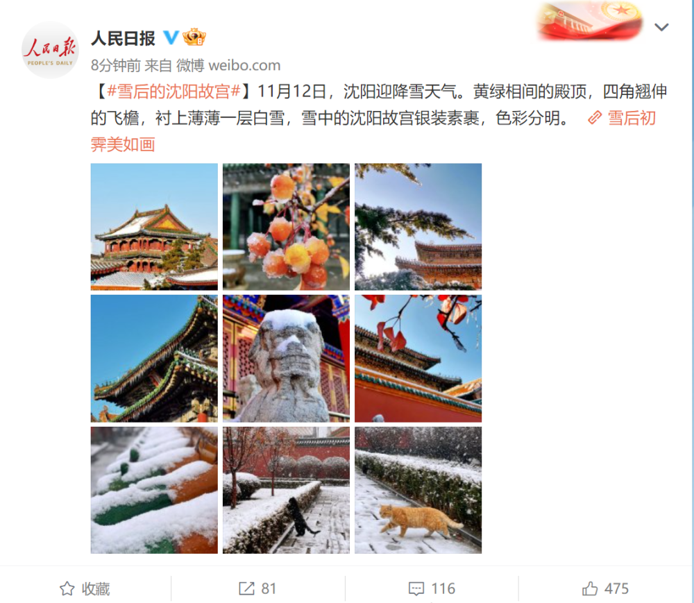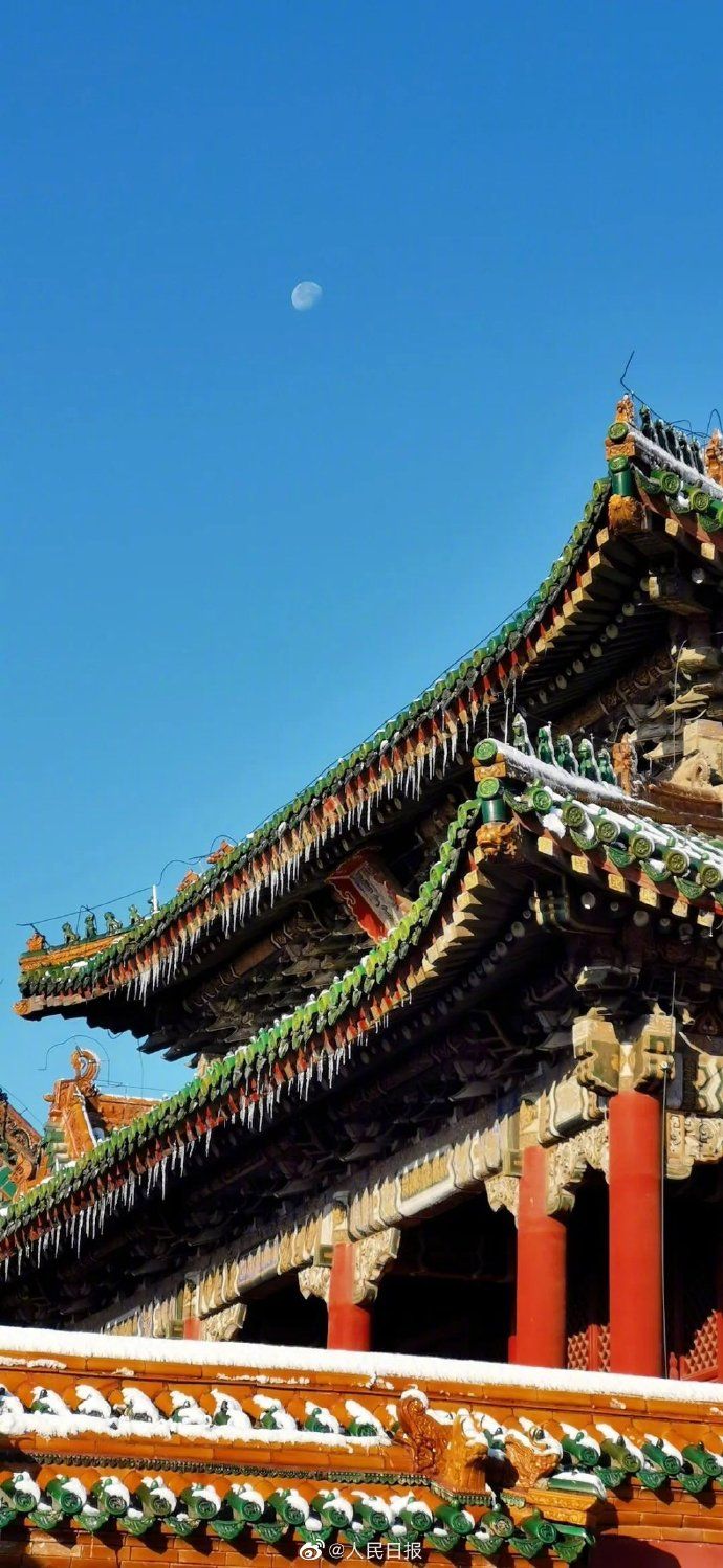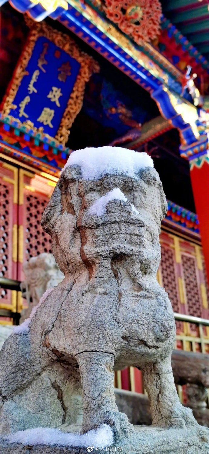 11月12日,沈阳迎降雪天气。黄绿相间的殿顶,四角翘伸的飞檐,衬上薄薄一层白雪,雪中的沈阳故宫银装素裹,色彩分明。
